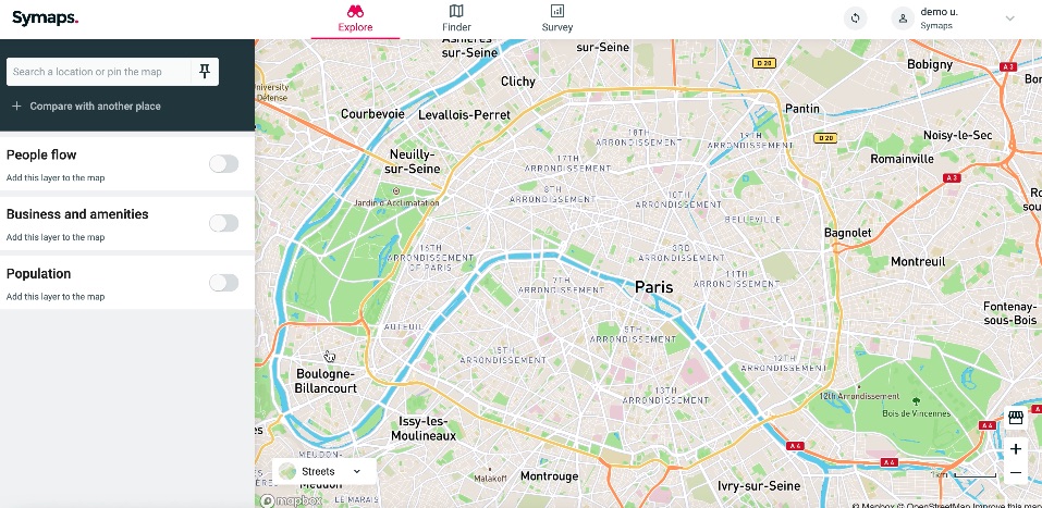 > Quickly explore a specific address or area. Here you will find information about people flow, businesses and amenities, and the local population. - Finder